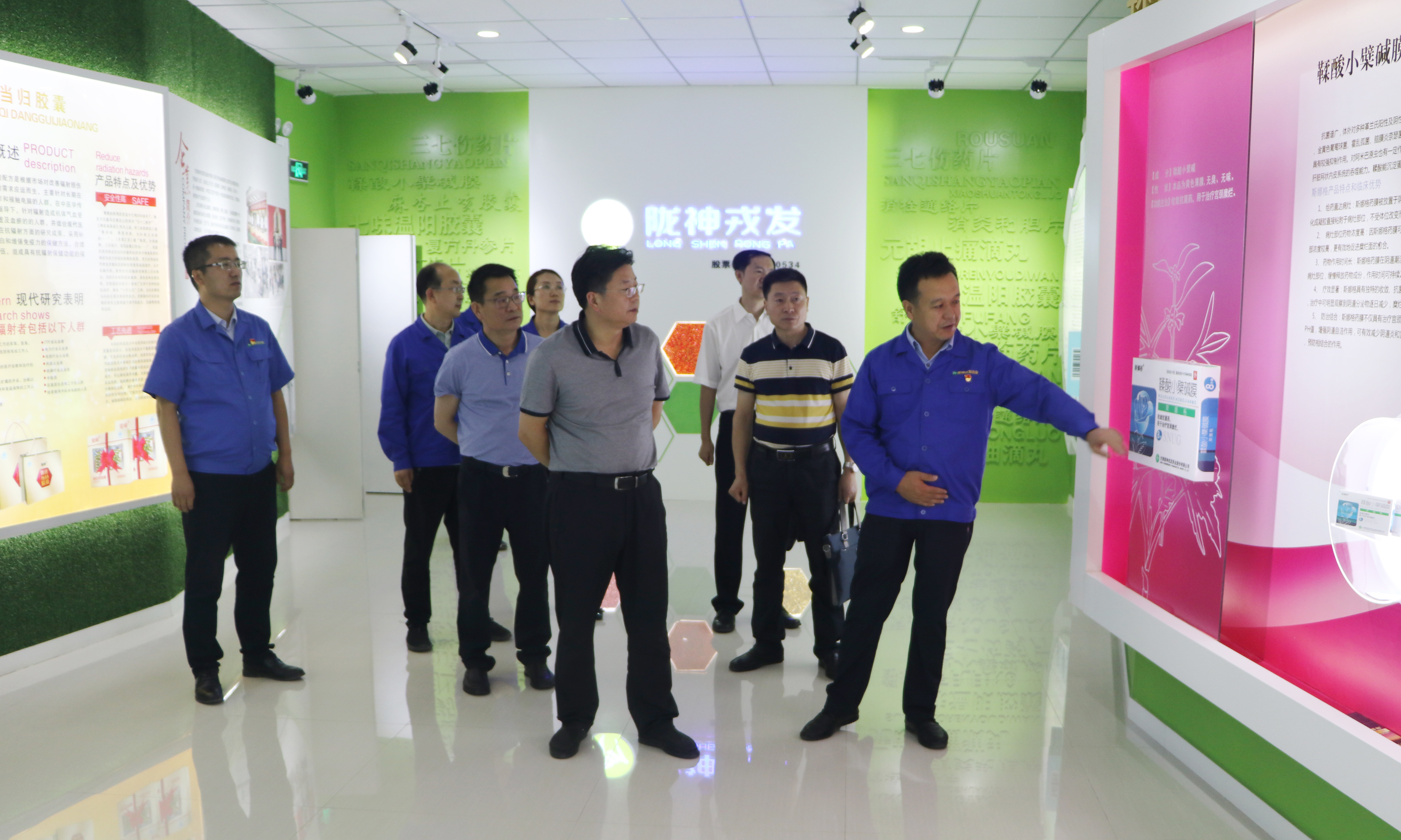 在產品展廳,黨委書記、總經理康永紅介紹了公司主打產品元胡止痛滴丸及斯娜格藥膜、酸棗仁油滴丸、七味溫陽膠囊等4個獨家品種和其它產品并結合隴神戎發“年產200億?,F代中藥生產線擴能改造項目”規劃圖,對已建成投入使用的七大單體樓宇逐一介紹。
