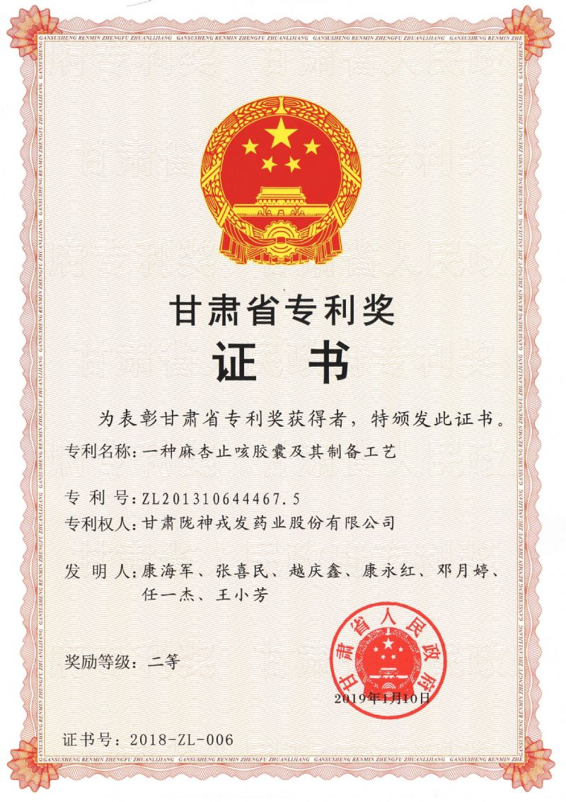 2月14日,甘肅省科學技術專利獎勵大會在寧臥莊賓館隆重召開。隴神戎發發明專利“一種麻杏止咳膠囊及其制備工藝”榮獲2018年甘肅省專利獎二等獎。此次獲獎專利中,一等獎5項,二等獎20項,三等獎25項。