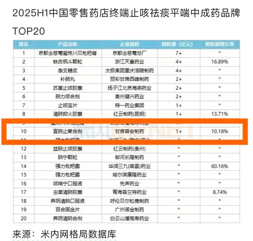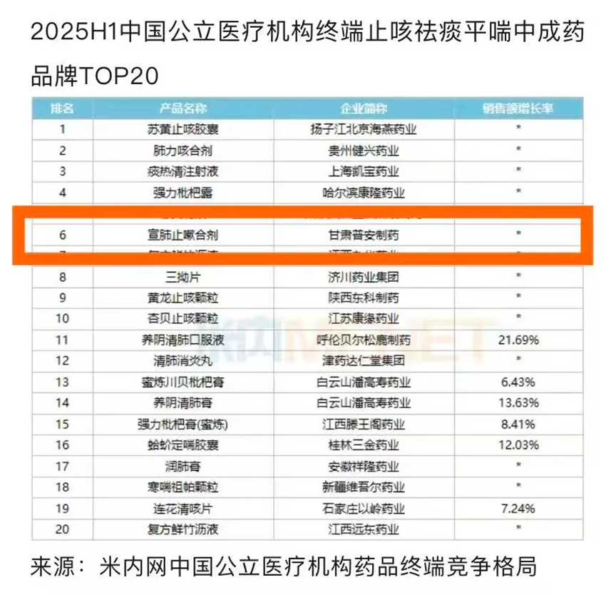 2025年上半年中國城市公立醫(yī)院、縣級(jí)公立醫(yī)院、城市社區(qū)中心以及鄉(xiāng)鎮(zhèn)衛(wèi)生院(簡稱中國公立醫(yī)療機(jī)構(gòu))終端止咳祛痰平喘中成藥集團(tuán)TOP20中,甘肅藥業(yè)集團(tuán)旗下甘肅普安制藥獨(dú)家生產(chǎn)的宣肺止嗽合劑位列第六名。