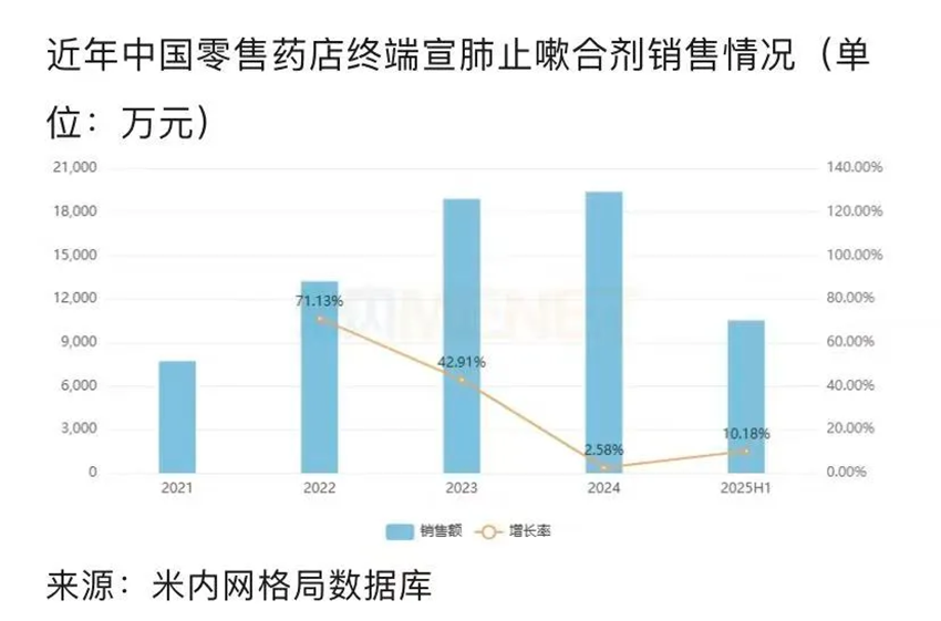 2025年上半年中國零售藥店終端止咳祛痰平喘中成藥集團(tuán)TOP20中,宣肺止嗽合劑因在近年中國零售藥店終端銷售額保持增長態(tài)勢,2025年上半年已超過1億元,同比增長10.18%,晉身到止咳祛痰平喘中成藥品牌TOP10之列。