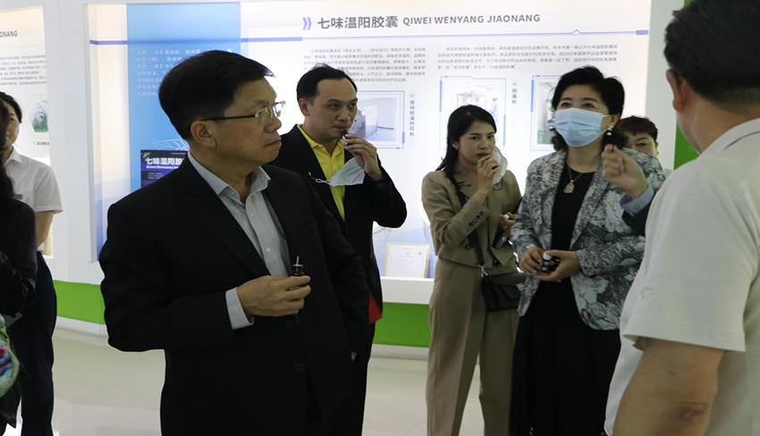 甘肅藥業投資集團有限公司黨委副書記、工會主席王賢斌,隴神戎發黨委委員、董事、副總經理兼董事會秘書元勤輝,副總經理、甘肅新絲路產業投資有限公司執行董事兼總經理李偉及相關人員陪同參觀考察。 參觀人員一行首先來到公司產品展廳及生產車間參觀,了解甘肅藥業集團及隴神戎發歷史沿革、發展歷程。在產品展廳聽取了隴神戎發四個全國獨家品種:元胡止痛滴丸,鞣酸小檗堿膜、七味溫陽膠囊、酸棗仁油滴丸以及保健食品黃芪當歸膠囊和其他普藥產品的介紹,對所屬企業普安制藥生產的宣肺止嗽合劑在對抗新冠疫情中發揮的重要作用及治療新冠病毒感染咳嗽癥狀緩解率98.27%的研究成果進行了詳細介紹,并就該產品進入泰國市場的條件現場與泰國衛生部傳統和替代醫學司進行了交流探討。參觀過程中,泰國衛生部傳統和替代醫學司司長一行對公司產品以及產品生產流程、藥理藥學、自動化設備以及中醫理論等表現出極大的興趣,現場飲用宣肺止嗽合劑,并對公司現代化先進生產設備及GMP管理給予高度評價。
