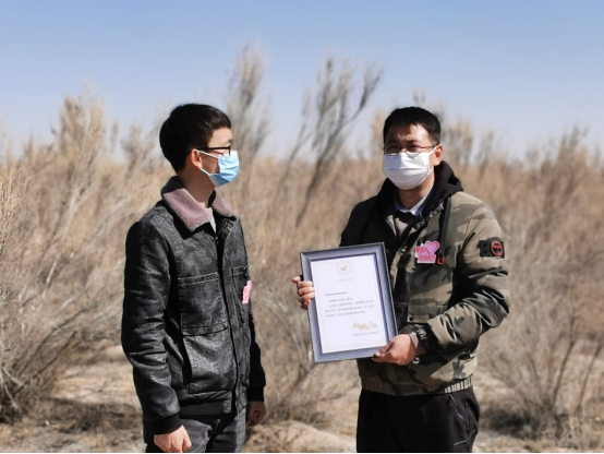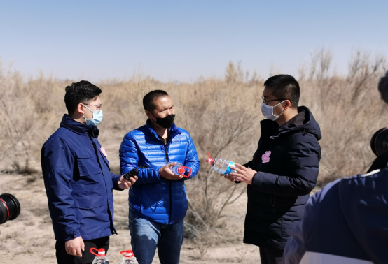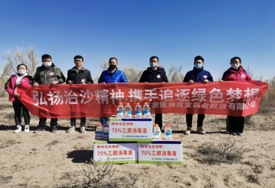 2020年3月16日,甘肅隴神戎發(fā)藥業(yè)股份有限公司志愿者一行4人與甘肅衛(wèi)視《好人在身邊》欄目組驅(qū)車400多公里,來到位于甘肅省武威市民勤縣的騰格里沙漠最西端,在一望無際的沙漠戈壁中學(xué)習(xí)打草格、種梭梭樹,感受了治沙志愿者為民勤的治沙事業(yè)所付出的艱辛勞動(dòng)。公司副總經(jīng)理錢雙喜代表隴神戎發(fā)為“青梭公益”的志愿者捐贈(zèng)公司生產(chǎn)的75%的乙醇消毒液,用于治沙志愿者在治沙過程中人員和器皿的消毒。
