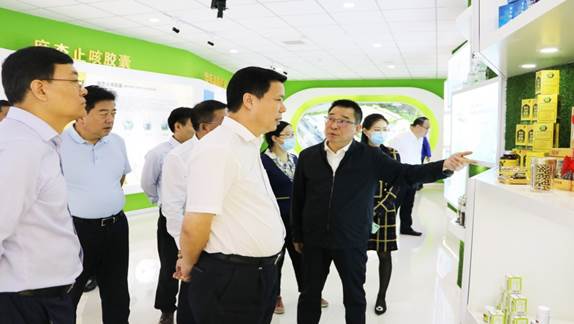 陳洪宛司長一行首先進入公司展廳進行參觀,在展廳宣傳展板前駐足聽取了康海軍董事長關于企業基本概況、發展歷程、改制上市等情況的匯報。隨后進入產品展廳,詳細了解公司產品元胡止痛滴丸、鞣酸小檗堿膜、七味溫陽膠囊等4個全國獨家品種和其他普藥品種,以及保健食品黃芪當歸膠囊。康海軍董事長還向陳洪宛司長重點介紹了公司一期項目建設及二期項目總體規劃情況。