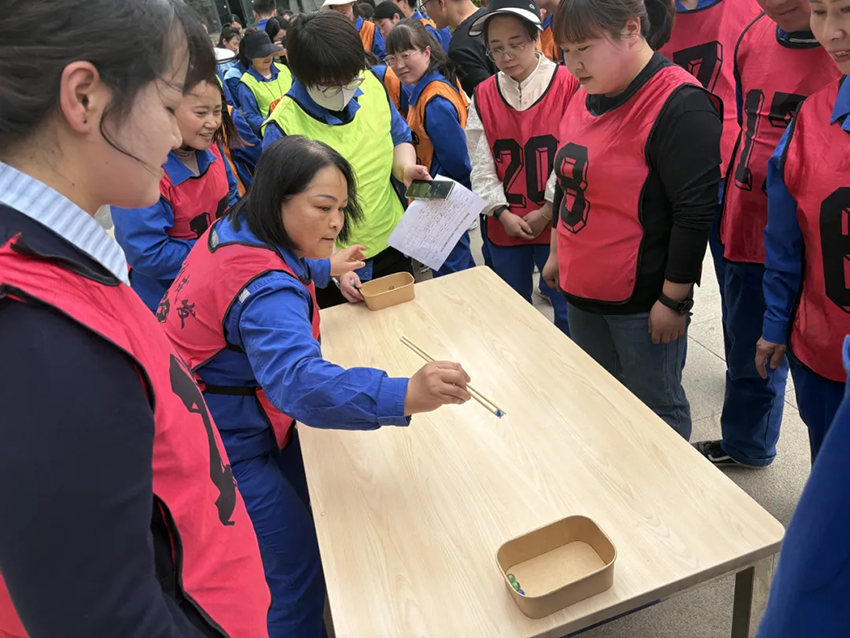 “夾珠大作戰” 看似簡單,實則需要極強的專注力和手部控制力。選手們手持筷子,小心翼翼地將珠子從一個容器夾到另一個容器。有的職工動作嫻熟,快速完成任務;有的則略顯緊張,珠子幾次掉落,但依然不氣餒,堅持完成比賽。