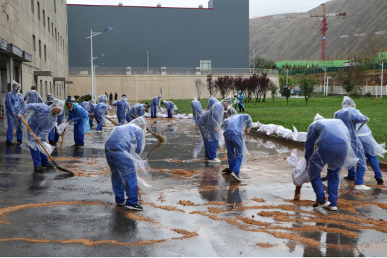 上午10點,應急演練正式開始,應急演練模擬情景為藥品生產(chǎn)車間2臺反應器底部封頭因地震損壞,尚未反應的液體原材料大量“泄漏”,因地震造成企業(yè)污水收集系統(tǒng)受損,部分“泄漏物”進入雨排系統(tǒng)排出廠界流向西河,一旦“泄漏物”流入西河,將造成嚴重的生態(tài)環(huán)境污染和社會影響?!笆鹿省卑l(fā)生后,隴神戎發(fā)第一時間啟動了公司突發(fā)環(huán)境應急預案,集結(jié)應急救援70余人,分5個小組(1、現(xiàn)場指揮組2、醫(yī)療救護、信息上報組3、警戒保衛(wèi)組4、現(xiàn)場救援組5、物資保障、應急檢測組)開始組織生產(chǎn)區(qū)員工疏散撤離,緊急關(guān)閉生產(chǎn)區(qū)電源,圍堵“泄漏物”,切斷雨排系統(tǒng),導入事故池。同時信息上報組向蘭州高新區(qū)建設(環(huán)保)局報告“事故”詳細情況。