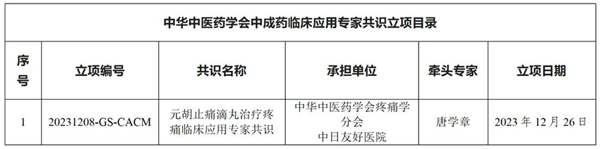為進一步做好中醫藥標準化工作,總結中成藥臨床應用的優勢與特點,全面收集專家的臨床應用經驗及中成藥循證醫學證據,形成共識,為中醫臨床診療指南制修訂工作提供參考,中華中醫藥學會標準化辦公室組織相關領域專家對《元胡止痛滴丸治療疼痛臨床應用專家共識》進行了立項審查,經學會辦公會審批,現予以公告。