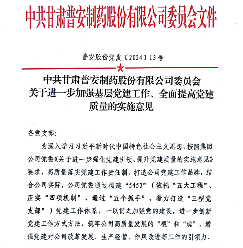 2024年,甘肅普安制藥股份有限公司黨委在甘肅藥業(yè)集團黨委的正確領(lǐng)導(dǎo)下,堅持黨建引領(lǐng),以“深耕細(xì)作挖潛能,降本增效做貢獻”為主線,錨定“黨建引領(lǐng)+節(jié)能降耗”的目標(biāo),扎實推進黨建與主業(yè)深度融合,切實將黨建優(yōu)勢轉(zhuǎn)化為發(fā)展優(yōu)勢。