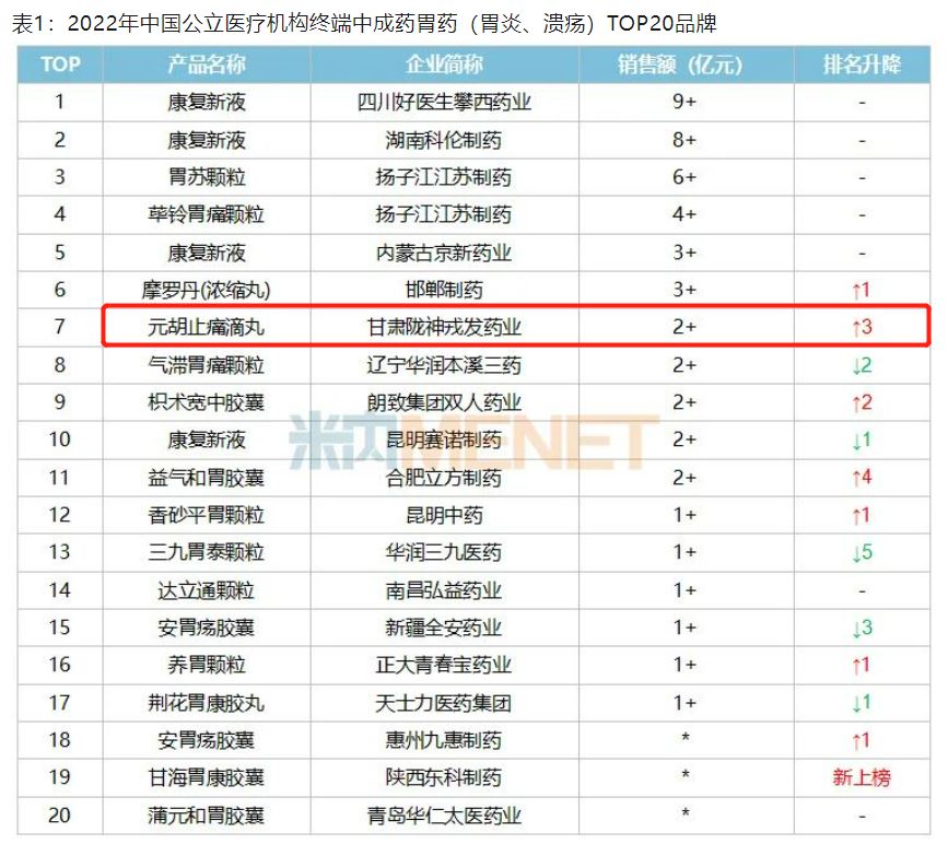 據統計,我國胃腸疾病患者有1.2億人,且發病率越來越高。據米內網最新數據顯示,2022年中國公立醫療機構終端中成藥胃藥(胃炎、潰瘍)銷售額保持在70億元水平。其中甘肅隴神戎發藥業的元胡止痛滴丸銷售額超過2億元,在2022年中國公立醫療機構終端中成藥胃藥(胃炎、潰瘍)TOP品牌排名第七。