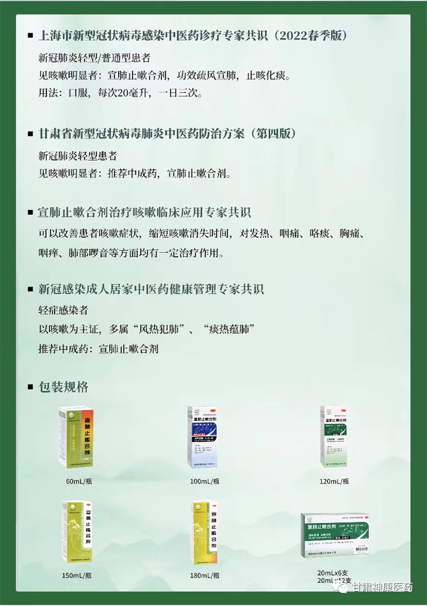 國家中醫藥管理局、國家中醫疫病防治基地等先后發布居家中醫藥干預指引、專家共識。全國各省(市)先后發布“新冠感染”居家治療用藥指南,甘肅藥業集團宣肺止嗽合劑獲多方權威機構推薦。多地政府機構、醫療衛生機構紛紛緊急訂購宣肺止嗽合劑,用以保障當地醫療衛生機構分級診療用藥及政府藥品備用。甘肅藥業集團全力組織藥品生產企業普安制藥開足馬力生產,盡最大努力保障群眾用藥需求。