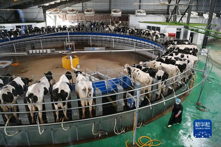 在武威市古浪縣生態奶牛產業園的一家企業牧場,工作人員在轉盤式擠奶機旁工作。
