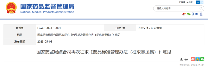 5月5日,國家藥監(jiān)局再次公開征求《藥品標(biāo)準(zhǔn)管理辦法(征求意見稿)》意見。