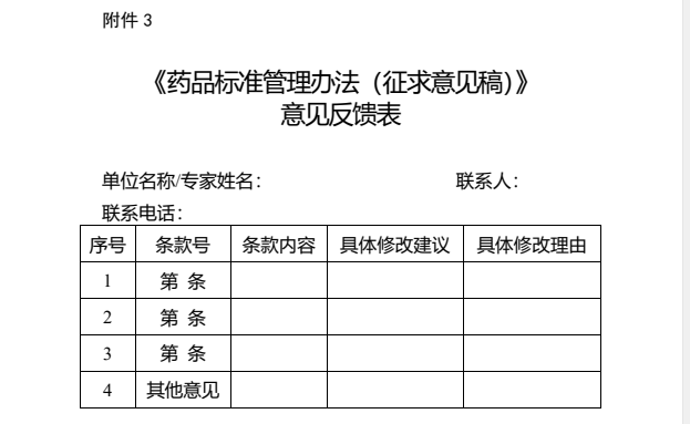 3.《藥品標(biāo)準(zhǔn)管理辦法(征求意見稿)》意見反饋表