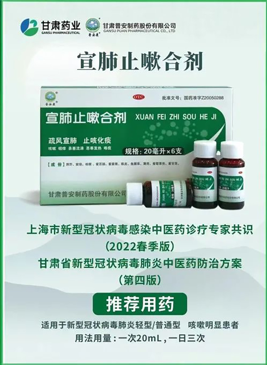 此次捐贈的宣肺止嗽合劑,為甘肅藥業集團旗下普安制藥股份有限公司生產的主打產品,先后被納入《上海市新型冠狀病毒感染中醫藥診療專家共識(2022春季版)》、《甘肅省新型冠狀病毒肺炎中醫藥防治方案(第四版)》推薦用藥,也被甘肅省援疆醫療隊和青海方艙醫院等作為重點選用的中成藥之一,適用于新型冠狀病毒肺炎輕型、普通型和咳嗽明顯患者。經實效性研究顯示,宣肺止嗽合劑治療新冠肺炎咳嗽癥狀緩解率達98.3%,7天咳嗽癥狀消失率為72.4% 。