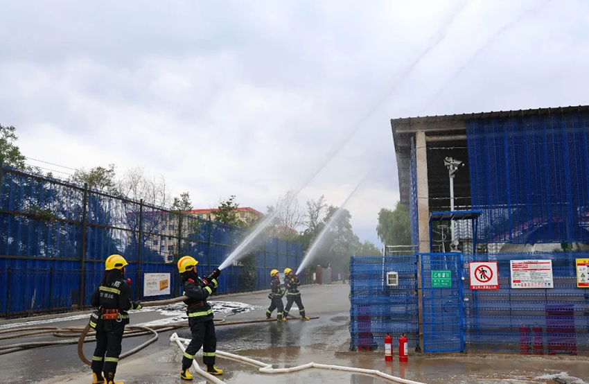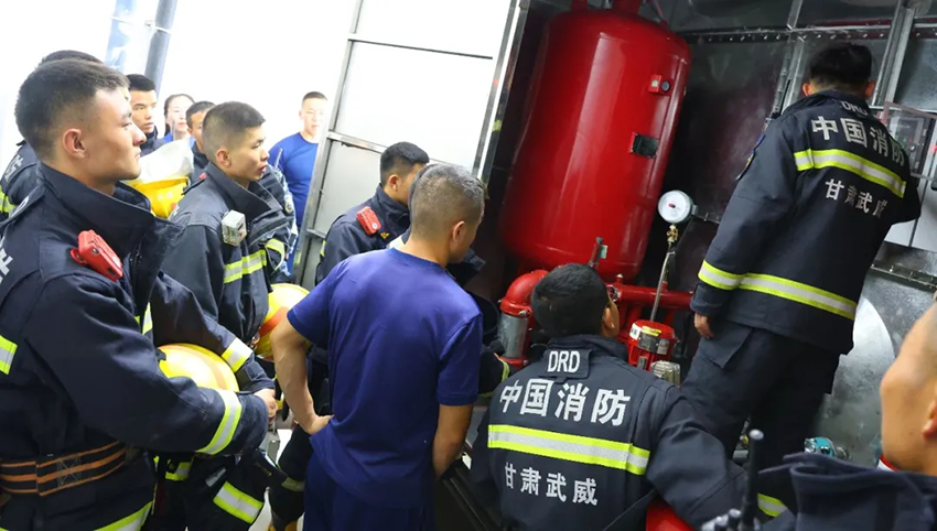 15時40分,火勢因泄漏量增大突然升級——10號罐底部出液閥燃起火焰,熱輻射導致相鄰罐溫度快速攀升。“啟動一級應急響應!”現場總指揮下達指令:“疏散組立即引導罐區周邊50米內人員撤離至安全區域;滅火組利用泡沫式滅火器壓制外圍火勢;通訊組聯系涼州區消防中隊請求支援!”