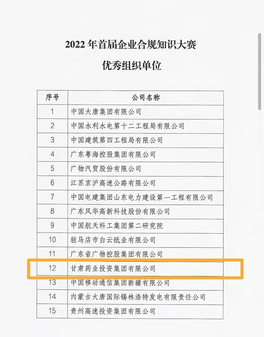2022年12月26日甘肅藥業(yè)投資集團有限公司獲得由法治日報社及中國企業(yè)評價協(xié)會頒發(fā)的“2022首屆全國企業(yè)合規(guī)知識大賽”優(yōu)秀組織單位獎。