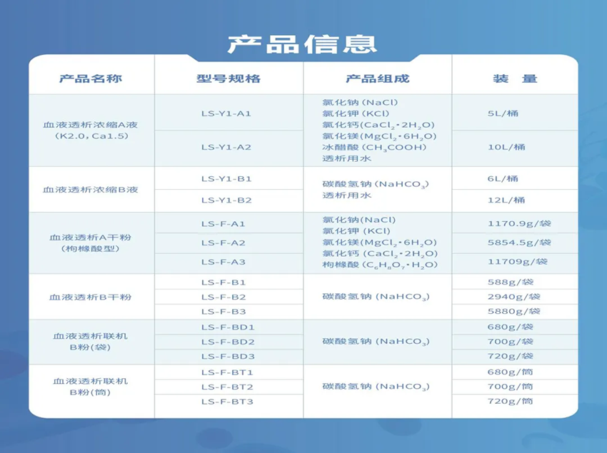 公司申請注冊成功的“血液透析濃縮液”和“血液透析干粉”均屬于血液透析濃縮物,產品醫療器械分類編碼為10-04-01,適用于急性腎衰竭、慢性腎衰竭的血液透析治療,已被臨床大量應用。此次注冊通過的產品離子濃度型號為“鉀2.0、鈣1.5”型,擁有1人份、2人份裝量,能滿足絕大多數患者與透析中心的使用需求。