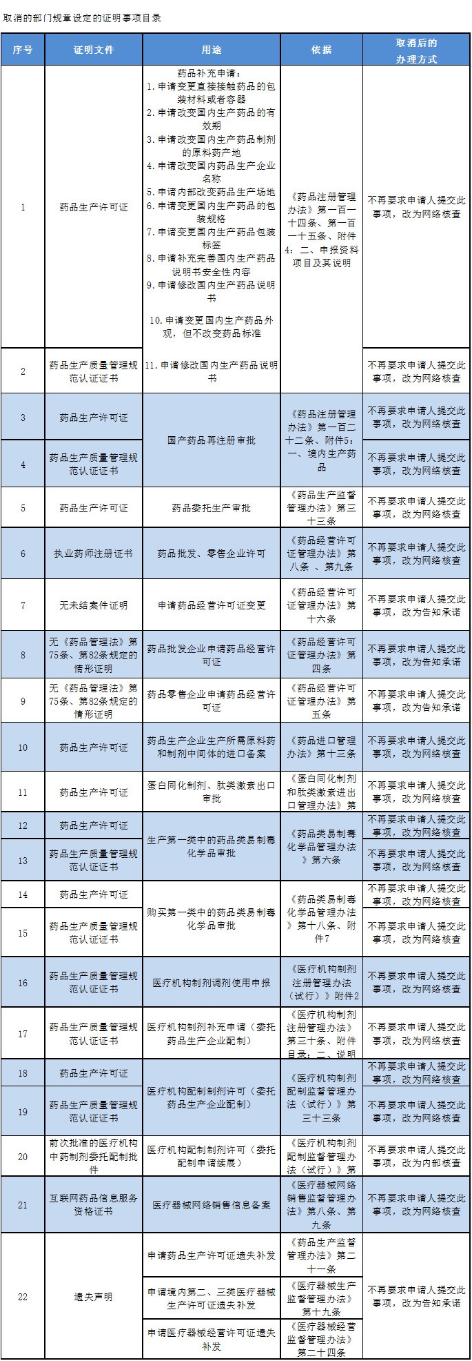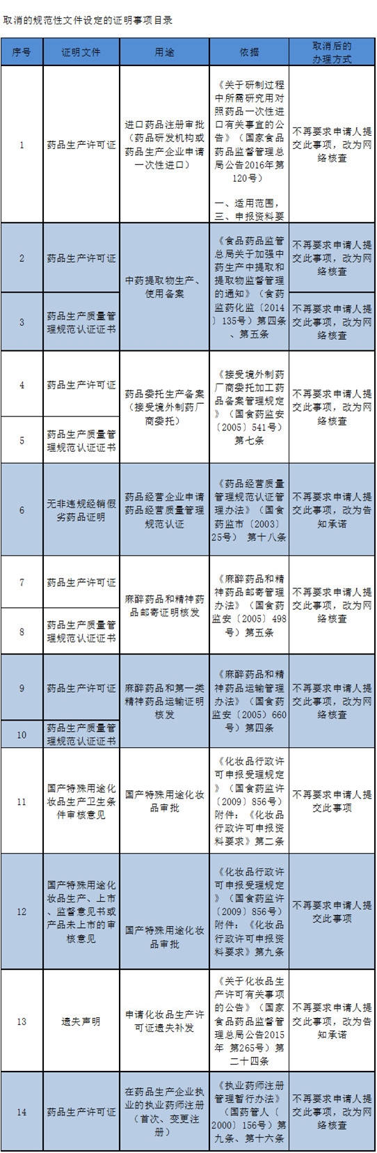 36項證明事項包括14項“規范性文件設定的證明事項”和24項“部門規章設定的證明事項”。很多事項,不再要求申請人提交此,改為網絡核查。涉及到藥品生產許可證、執業藥師注冊證書等諸多方面。