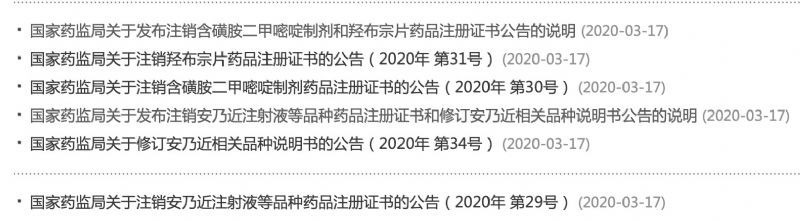 2020年03月17日國(guó)家藥品監(jiān)督管理局(NMPA)連續(xù)發(fā)布了6個(gè)關(guān)于安乃近注射液、含磺胺二甲嘧啶制劑、羥布宗片等品種注銷公告。