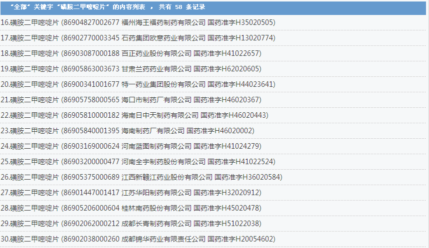 磺胺二甲嘧啶片:58個(gè)批準(zhǔn)文號(hào)
