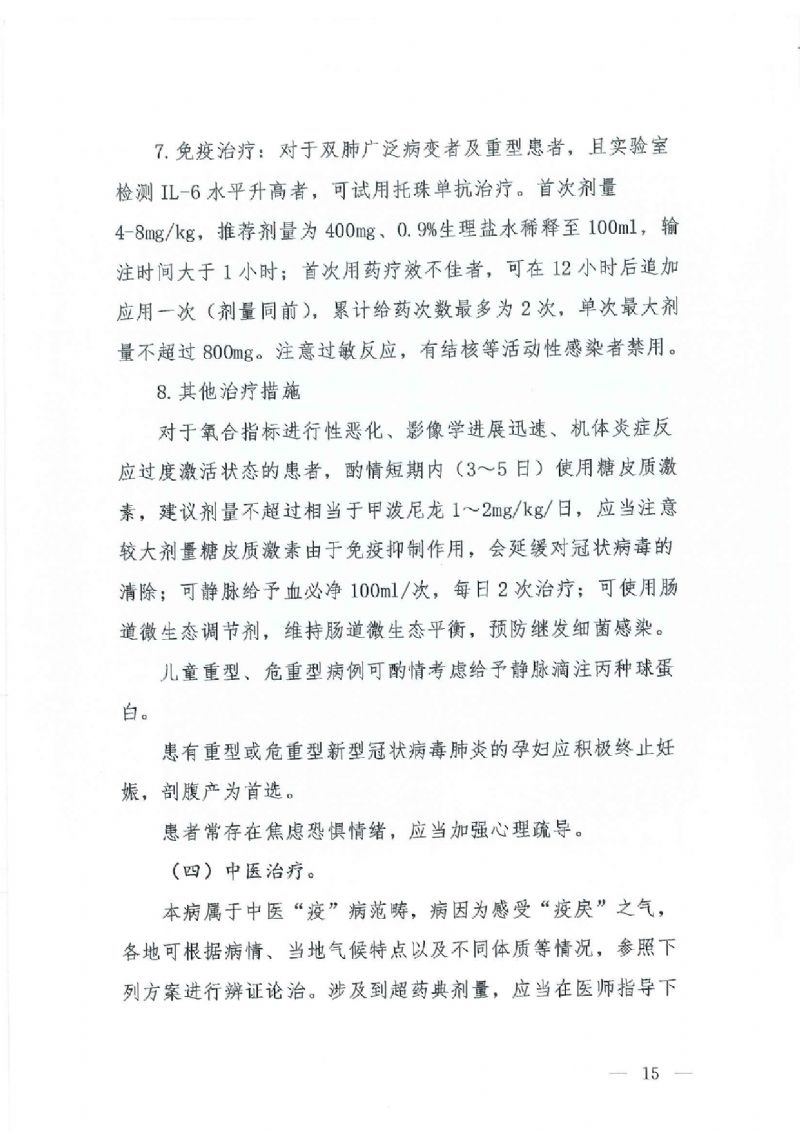 6.增加“托珠單抗”用于免疫治療:適應證為“雙肺廣泛病變者及重型患者,且實驗室檢測IL-6水平升高者”。給出了具體用法、用量,要注意過敏反應,有結核等活動性感染者禁用。