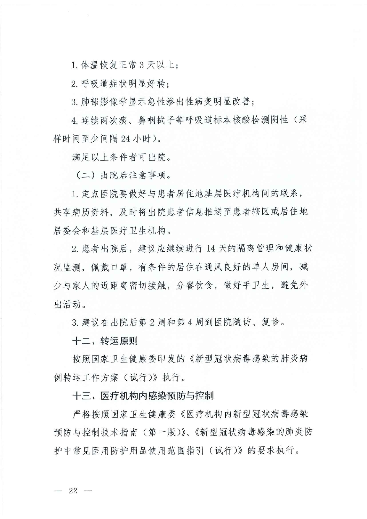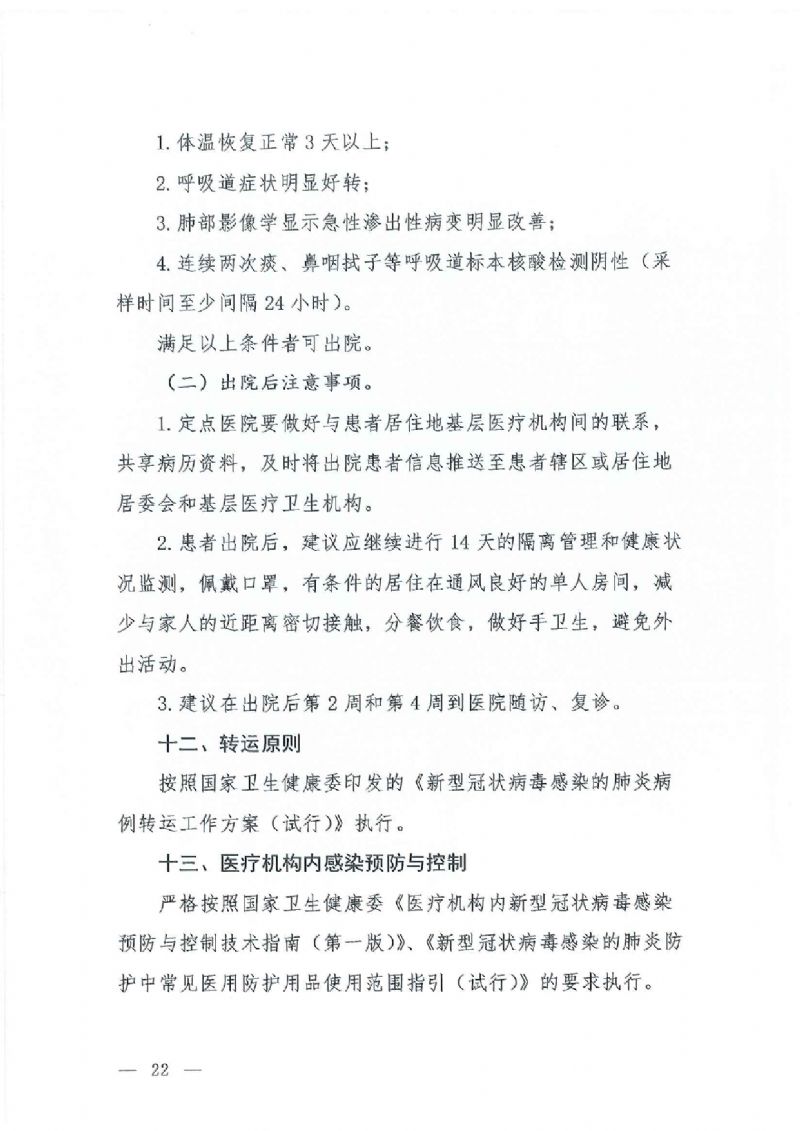 (二)出院后注意事項。鑒于有少數出院患者出現核酸檢測復檢陽性的問題,為加強對出院患者的健康管理和隔離,將“應繼續進行14天自我健康狀況監測”改為“應繼續進行14天的隔離管理和健康狀況監測”,同時要求佩戴口罩,有條件的居住在通風良好的單人房間,減少與家人的近距離密切接觸,分餐飲食,做好手衛生,避免外出活動。