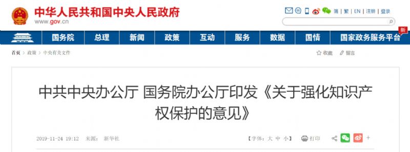 新華社北京11月24日電 近日,中共中央辦公廳、國務(wù)院辦公廳印發(fā)了《關(guān)于強(qiáng)化知識產(chǎn)權(quán)保護(hù)的意見》,并發(fā)出通知,要求各地區(qū)各部門結(jié)合實(shí)際認(rèn)真貫徹落實(shí)。