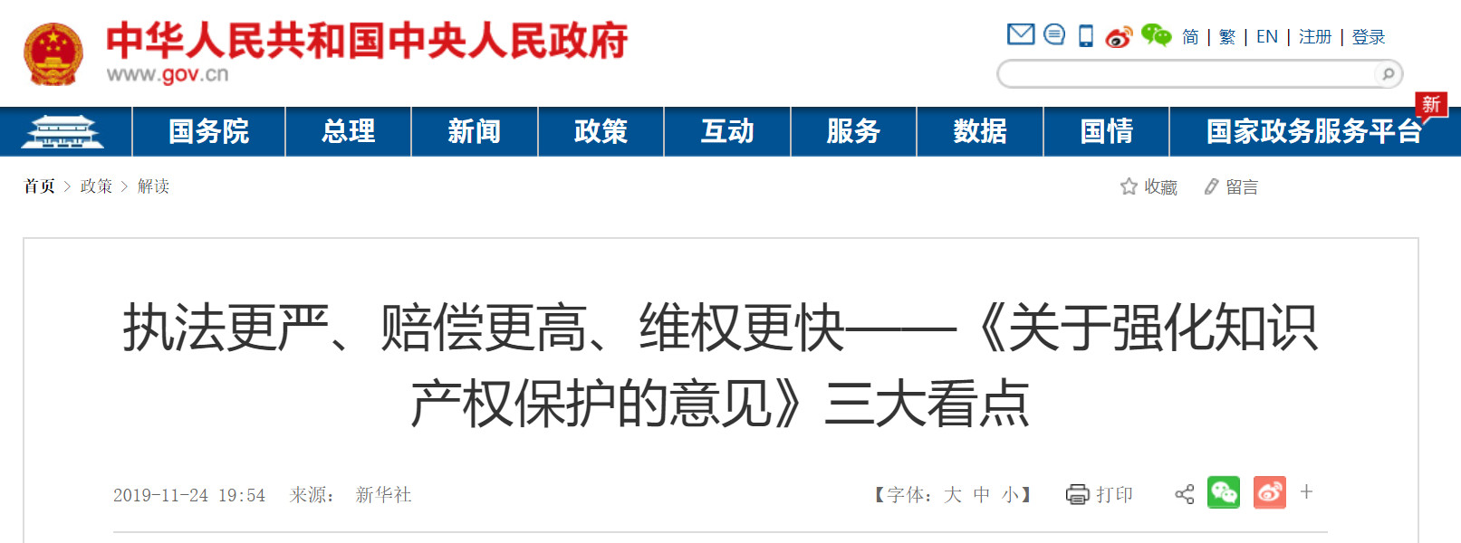新華社北京11月24日電 題:執(zhí)法更嚴(yán)、賠償更高、維權(quán)更快——《關(guān)于強(qiáng)化知識產(chǎn)權(quán)保護(hù)的意見》三大看點(diǎn)