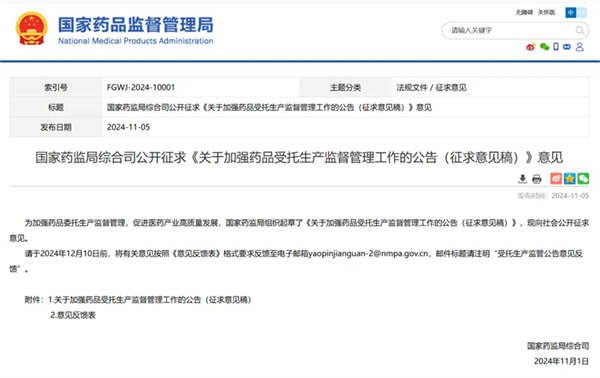 請于2024年12月10日前,將有關意見按照《意見反饋表》格式要求反饋至電子郵箱yaopinjianguan-2@nmpa.gov.cn,郵件標題請注明“受托生產監管公告意見反饋”。