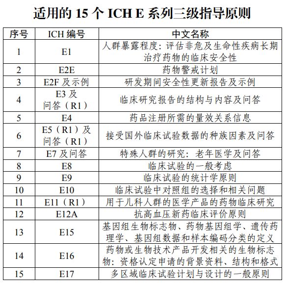 國(guó)家藥監(jiān)局關(guān)于適用《E1:人群暴露程度:評(píng)估非危及生命性疾病長(zhǎng)期治療藥物的臨床安全性》等15個(gè)國(guó)際人用藥品注冊(cè)技術(shù)協(xié)調(diào)會(huì)指導(dǎo)原則的公告 (2019年第88號(hào)) 為推動(dòng)藥品注冊(cè)技術(shù)標(biāo)準(zhǔn)與國(guó)際接軌,經(jīng)研究,國(guó)家藥品監(jiān)督管理局決定適用《E1:人群暴露程度:評(píng)估非危及生命性疾病長(zhǎng)期治療藥物的臨床安全性》等15個(gè)國(guó)際人用藥品注冊(cè)技術(shù)協(xié)調(diào)會(huì)(ICH)指導(dǎo)原則(詳見(jiàn)附件)。現(xiàn)就有關(guān)事項(xiàng)公告如下。 一、本公告發(fā)布之日起適用《E2F:研發(fā)期間安全性更新報(bào)告》及《E2F示例》、《E5(R1):接受國(guó)外臨床試驗(yàn)數(shù)據(jù)的種族因素》及《E5問(wèn)答(R1)》和《E17:多區(qū)域臨床試驗(yàn)計(jì)劃與設(shè)計(jì)的一般原則》。 二、本公告發(fā)布之日起6個(gè)月后受理的新藥上市申請(qǐng)適用《E3:臨床研究報(bào)告的結(jié)構(gòu)與內(nèi)容》及《E3問(wèn)答(R1)》。 三、本公告發(fā)布之日起3個(gè)月后受理的新藥上市申請(qǐng)以及6個(gè)月后批準(zhǔn)的新藥上市申請(qǐng)適用《E2E:藥物警戒計(jì)劃》。 四、本公告發(fā)布之日起6個(gè)月后啟動(dòng)的藥物臨床研究的相關(guān)要求適用《E4:藥品注冊(cè)所需的量效關(guān)系信息》、《E7:特殊人群的研究:老年醫(yī)學(xué)》及《E7問(wèn)答》、《E8:臨床試驗(yàn)的一般考慮》、《E9:臨床試驗(yàn)的統(tǒng)計(jì)學(xué)原則》、《E10:臨床試驗(yàn)中對(duì)照組的選擇以及相關(guān)問(wèn)題》、《E11(R1):用于兒科人群的醫(yī)學(xué)產(chǎn)品的藥物臨床研究》、《E15:基因組生物標(biāo)志物、藥物基因組學(xué)、遺傳藥理學(xué)、基因組數(shù)據(jù)以及樣本編碼分類的定義》、《E16:與藥物或生物制品研發(fā)相關(guān)的生物標(biāo)志物:資質(zhì)提交材料的背景、結(jié)構(gòu)以及格式》。 五、本公告發(fā)布之日起6個(gè)月后批準(zhǔn)的臨床試驗(yàn)申請(qǐng)以及3年后受理的新藥上市申請(qǐng)適用《E1:人群暴露程度:評(píng)估非危及生命性疾病長(zhǎng)期治療藥物的臨床安全性》。 六、本公告發(fā)布之日起6個(gè)月后新型抗高血壓藥物臨床研究適用《E12A:新型抗高血壓藥物的臨床評(píng)價(jià)原則》,其中安全性評(píng)估所需受試者樣本量要求按照E1實(shí)施時(shí)間點(diǎn)要求。 相關(guān)技術(shù)指導(dǎo)原則可在國(guó)家藥品監(jiān)督管理局藥品審評(píng)中心網(wǎng)站查詢。國(guó)家藥品監(jiān)督管理局藥品審評(píng)中心負(fù)責(zé)做好本公告實(shí)施過(guò)程中的相關(guān)技術(shù)指導(dǎo)工作。 特此公告。 國(guó)家藥監(jiān)局 2019年11月5日