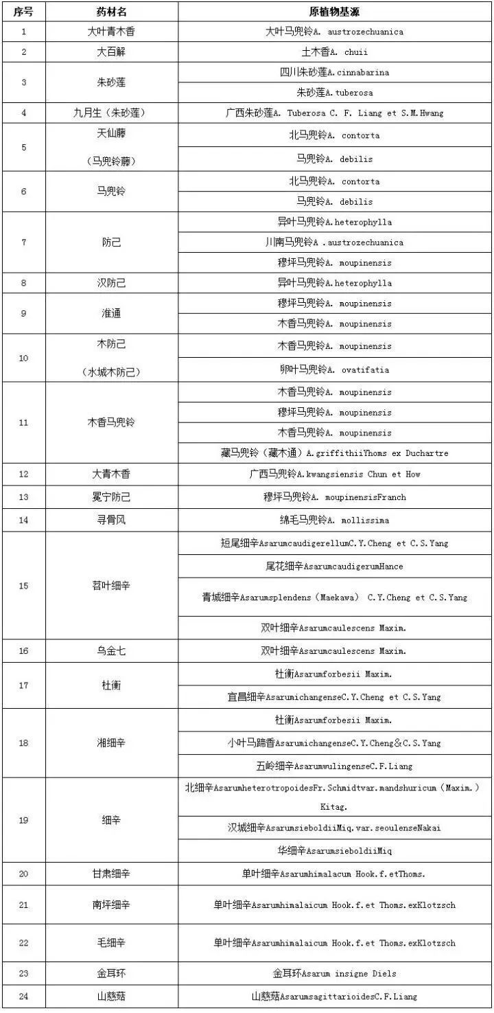 1.關木通、青木香、廣防己的藥材標準已撤銷,故未列入。