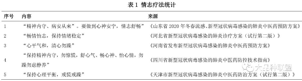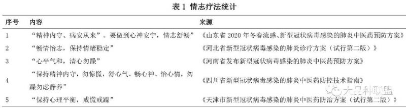 情志療法是中醫臨床上重要的療法之一。在新冠肺炎預防中,很多省份發布的中醫藥防治方案中都有提及情志療法,如2020年1月27日山東省衛健委發布的《山東省2020年冬春流感、新型冠狀病毒感染的肺炎中醫藥預防方案》之“‘精神內守、病安從來’。要做到心神安寧,情志舒暢”的闡述;2020年1月30日河北省發布的《新型冠狀病毒感染的肺炎診療方案(試行第二版)》之“暢情怡志,保持情緒穩定”的描述;2020年1月27日河南省《河南省發布新型冠狀病毒感染的肺炎中醫藥預防方案》之“心平氣和,清心勿躁”的強調等等。具體見下表1。
