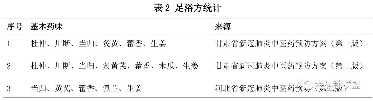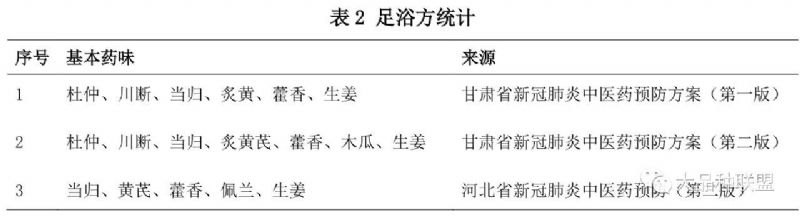 足浴也是中醫藥養生保健的重要內容,通過添加適當適量的中藥,可達到扶正祛邪,增強體質的作用。通過統計,發現有3個足浴方。其中藿香、生姜、黃芪、當歸應用較多。見表2。