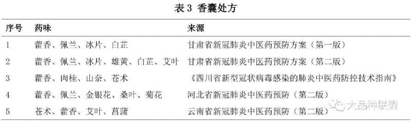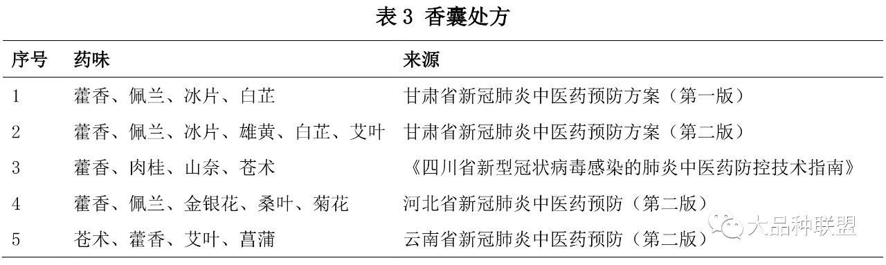 香薰即為香囊、藥物熏,是空氣消毒的有效方法之一。其香囊根據“芳香辟穢”“芳香化濁”等原理,具有驅蟲、凈化空氣等作用;藥物熏主要有煮水熏和點燃熏,如《四川省新型冠狀病毒感染的肺炎中醫藥防控技術指南》就發布了一個煮水熏的方子,原文為:熏蒸處方:板藍根10g、石菖蒲10g、貫眾10g、金銀花15g,加水1000ml,泡10分鐘,小火慢煮30分鐘,濃縮藥液150ml。使用時在室內進行,將熏蒸方藥液加入洗凈的家用空氣加濕器中通電熏蒸或者在鍋中持續蒸煮揮發,每天1-2次;點燃熏在民間較普遍,如艾熏、蒼術熏等。為安全起見,香囊最為保險。此次,也有香囊方的推薦,主要藥物為藿香、佩蘭、白芷、艾葉等。具體見表3。