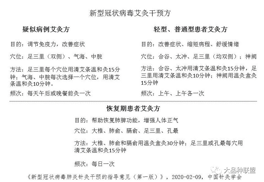艾灸和穴位按摩在日常的生活中常見,被大多數人熟悉。其同樣能達到預防、治療疾病的作用。 2020年2月9日中國針灸學會發布了《新型冠狀病毒肺炎針灸干預指導意見(第一版)》,對疑似病例,輕型、普通型患者,恢復期患者分別給予了艾灸干預方。見圖1。