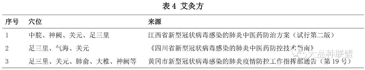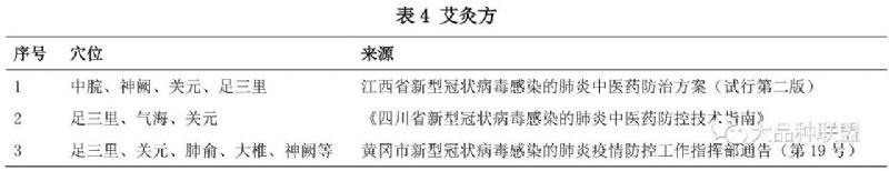 同樣,部分省中醫藥預防方案中也有艾灸的提及,大多數穴位為中脘、神闕、關元、足三里,均為健脾祛濕、顧護脾胃的穴位,簡單易操作。見表4。