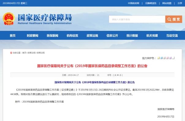 國家醫療保障局關于公布《2019年國家醫保藥品目錄調整工作方案》的公告