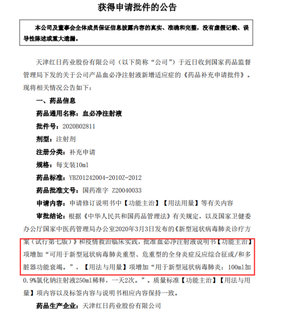 4月14日,紅日藥業發布公告稱,于近日收到國家藥品監督管理局下發的關于血必凈注射液新增適應癥的《藥品補充申請批件》,【功能主治】項增加“可用于新型冠狀病毒肺炎重型、危重型的全身炎癥反應綜合征或/和多臟器功能衰竭。”