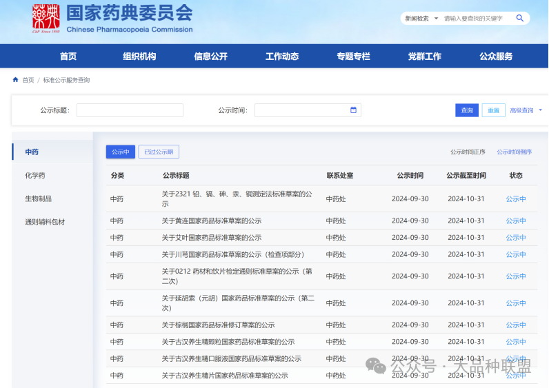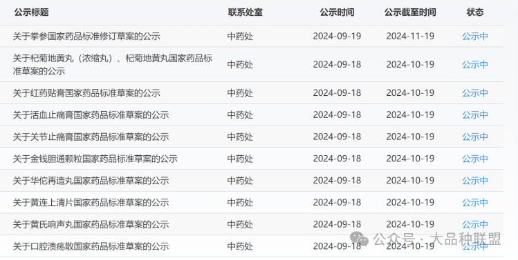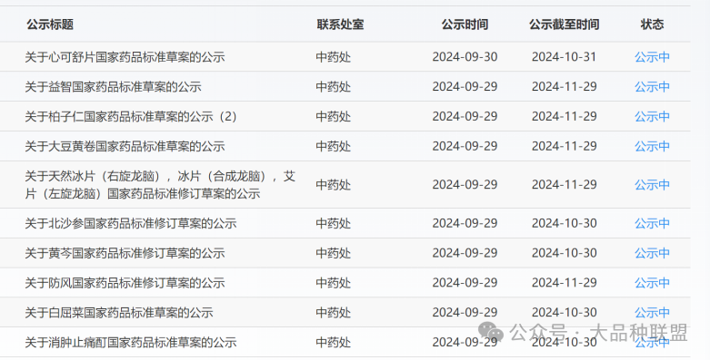 2024年9月29-30日,國(guó)家藥典委公示了19個(gè)中藥標(biāo)準(zhǔn)草案:黃連、艾葉、川芎、延胡索(元胡)、棕櫚、益智、柏子仁、大豆黃卷、北沙參、黃芩、防風(fēng)、白屈菜、天然冰片(右旋龍腦),冰片(合成龍腦),艾片(左旋龍腦);古漢養(yǎng)生精顆粒、古漢養(yǎng)生精口服液、古漢養(yǎng)生精片、心可舒片、消腫止痛酊。