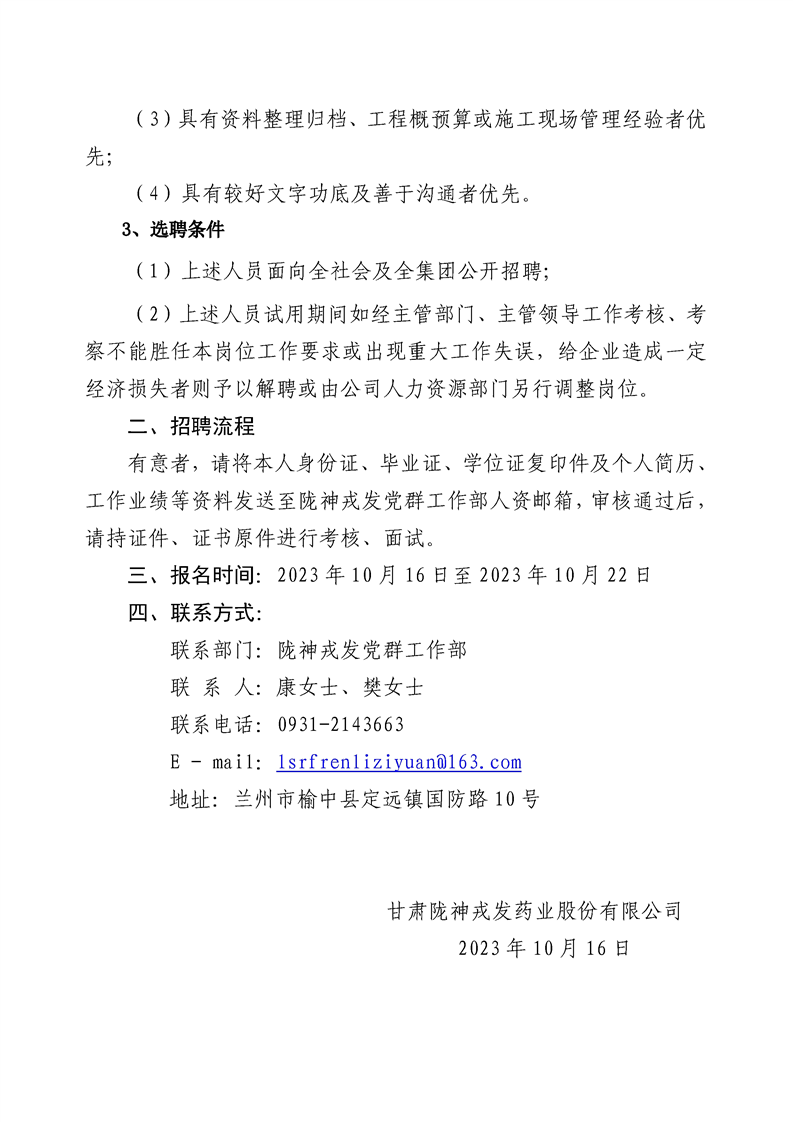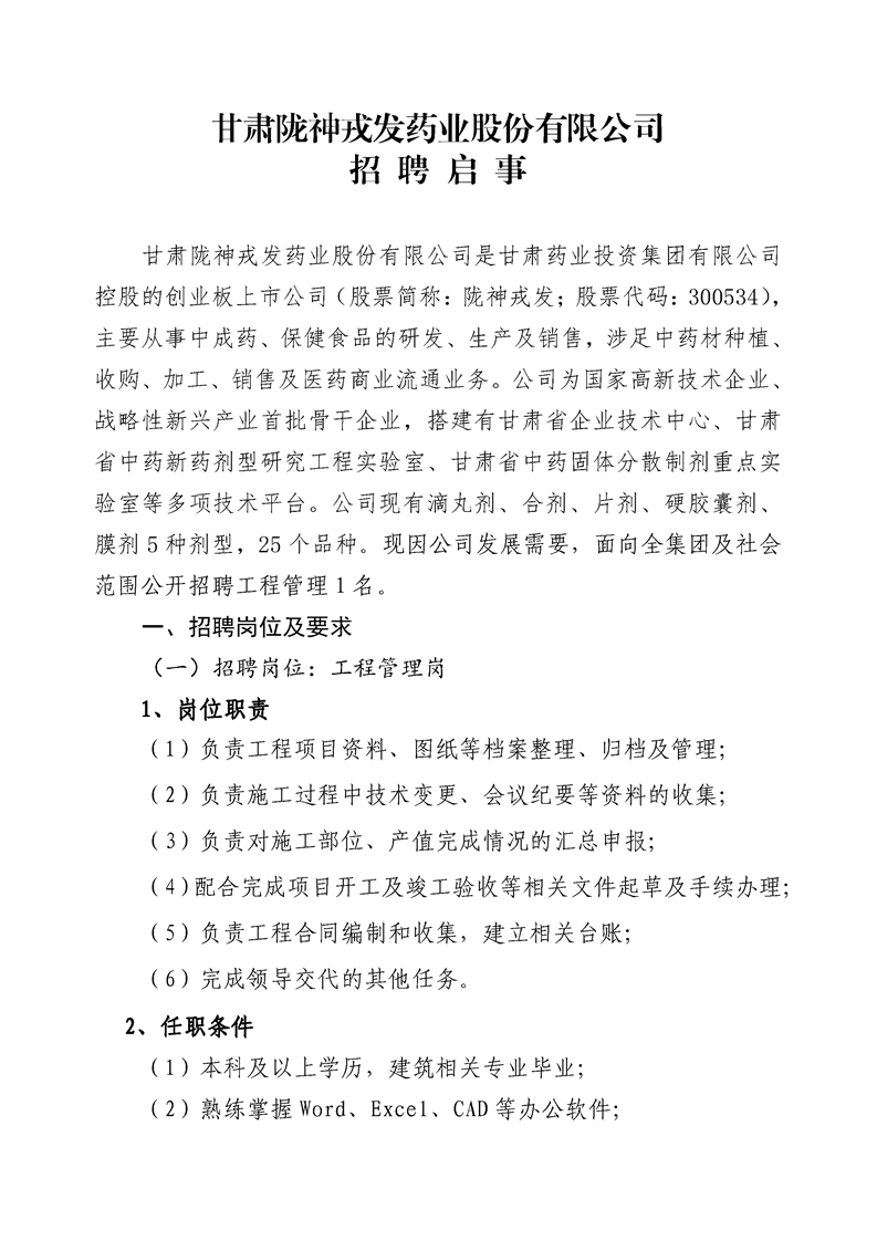 甘肅隴神戎發藥業股份有限公司招聘啟事