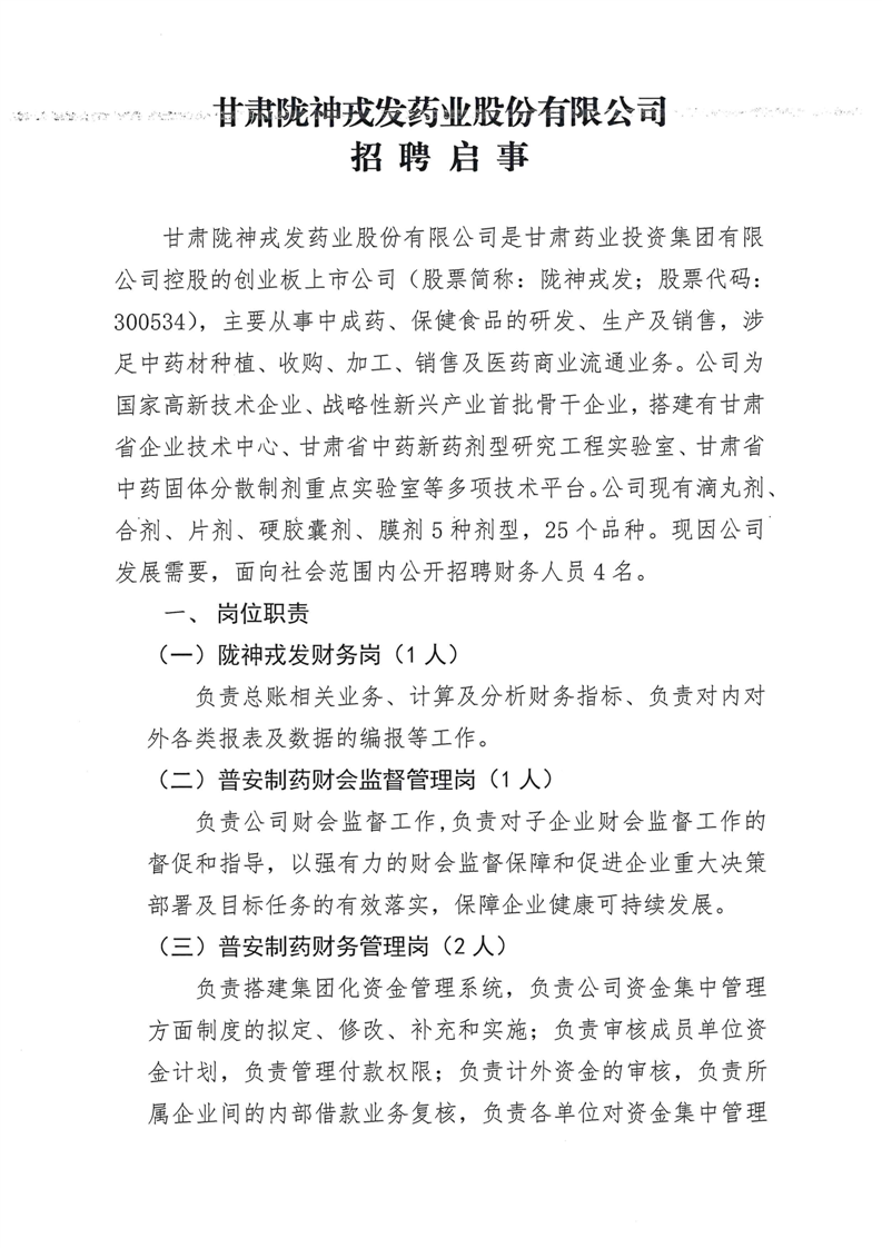 甘肅隴神戎發藥業股份有限公司招聘啟事
